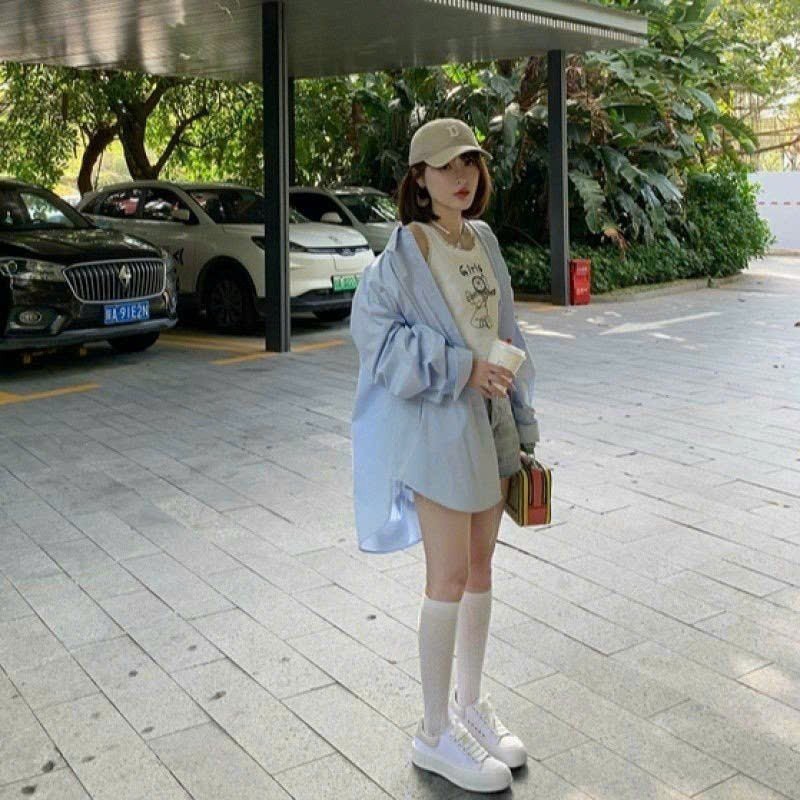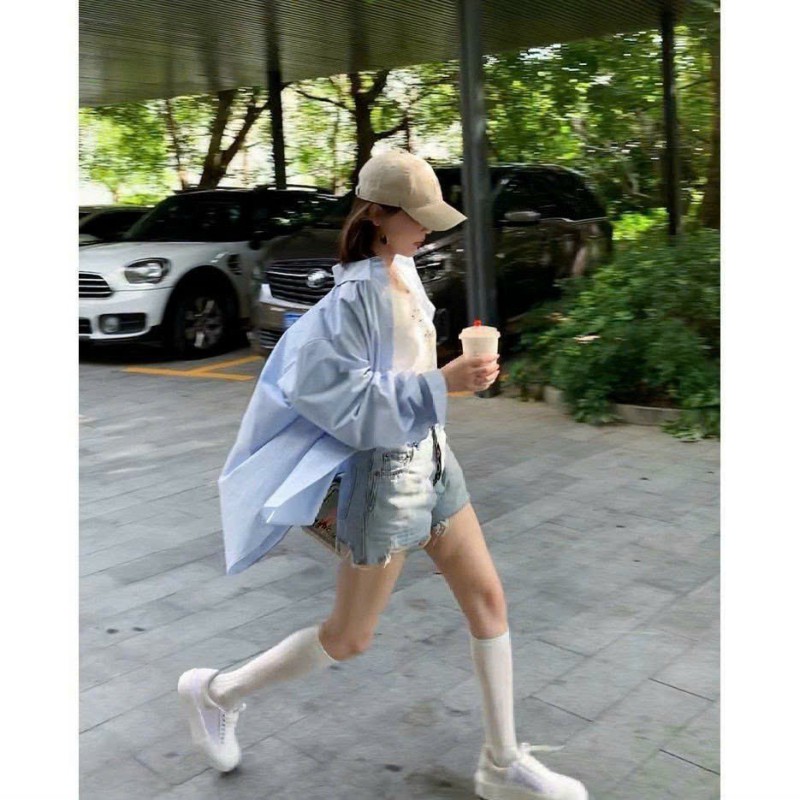 Áo Sơ Mi Nữ Form Rộng Dài Tay Cotton Lụa Hàn Unisex Màu Xanh Dương Cực Xinh - 539.6