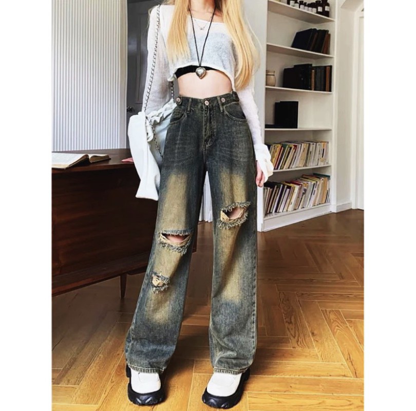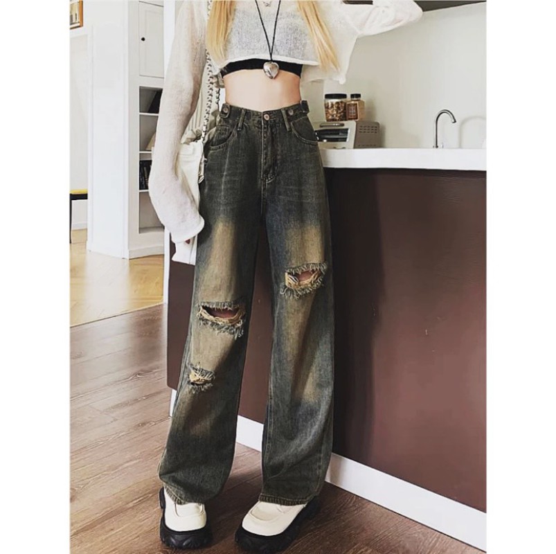 Quần Jean Nữ Ống Rộng Lưng Cao Wash Vàng Rách Phối Nút Eo Cực Cá Tính Phong Cách Hàn Quốc 314.4