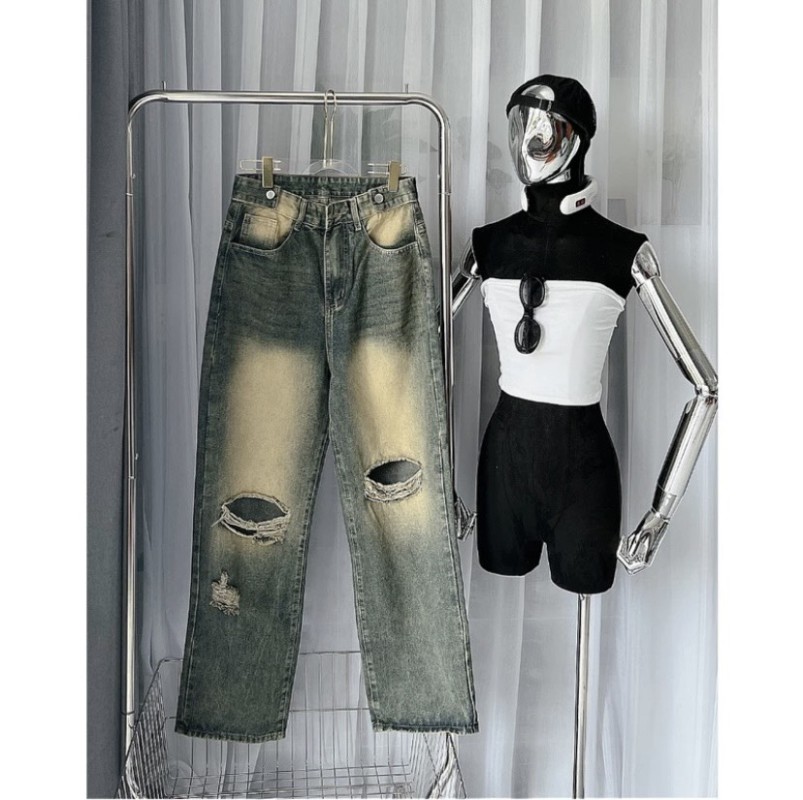 ❌ THÔNG TIN SẢN PHẨM : Quần Jean Nữ Ống Rộng Lưng Cao Wash Vàng Rách Phối Nút Eo Cực Cá Tính Phong Cách Hàn Quốc 314