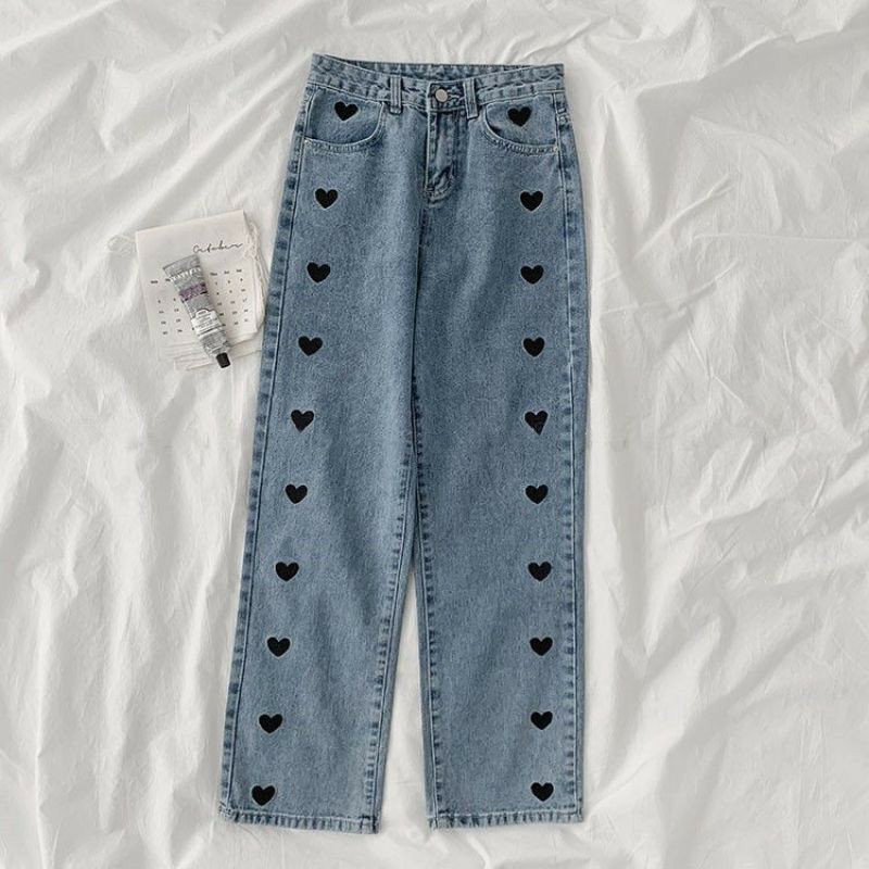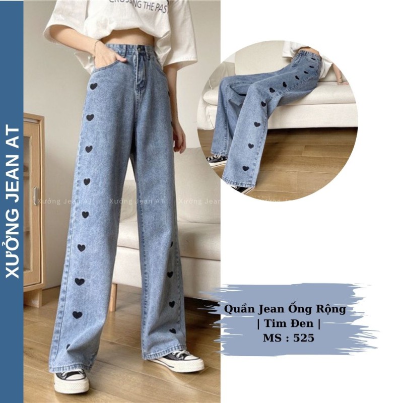 Quần Jean Nữ Ống Rộng Màu Xanh Nhạt Chất Bò Kèm Hoạ Tiết Trái Tim Phong Cách Trẻ Trung 525