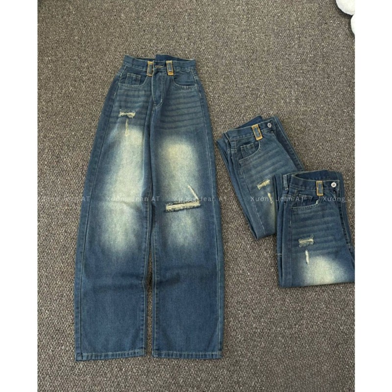 ❌ THÔNG TIN SẢN PHẨM : Quần Jean Nữ Ống Rộng Xanh Đậm Wash Bụi Rách Phối Màu Đai Kiểu Phía Trước Phong Cách Hàn Quốc 573.2