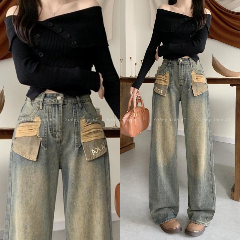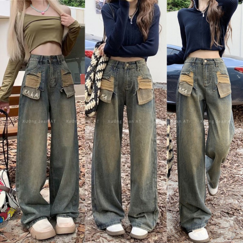 ❌ THÔNG TIN SẢN PHẨM : Quần Jean Nữ Ống Suông Rộng Wash Bụi Phối Túi Rách Thêu Chữ KAKA Phong Cách Retro Cực Chất 471