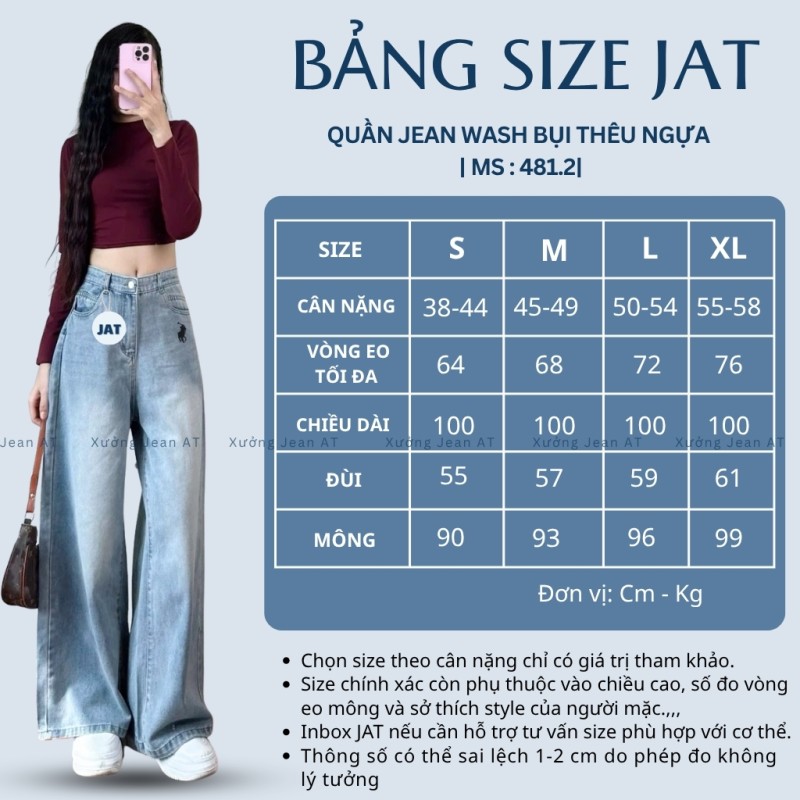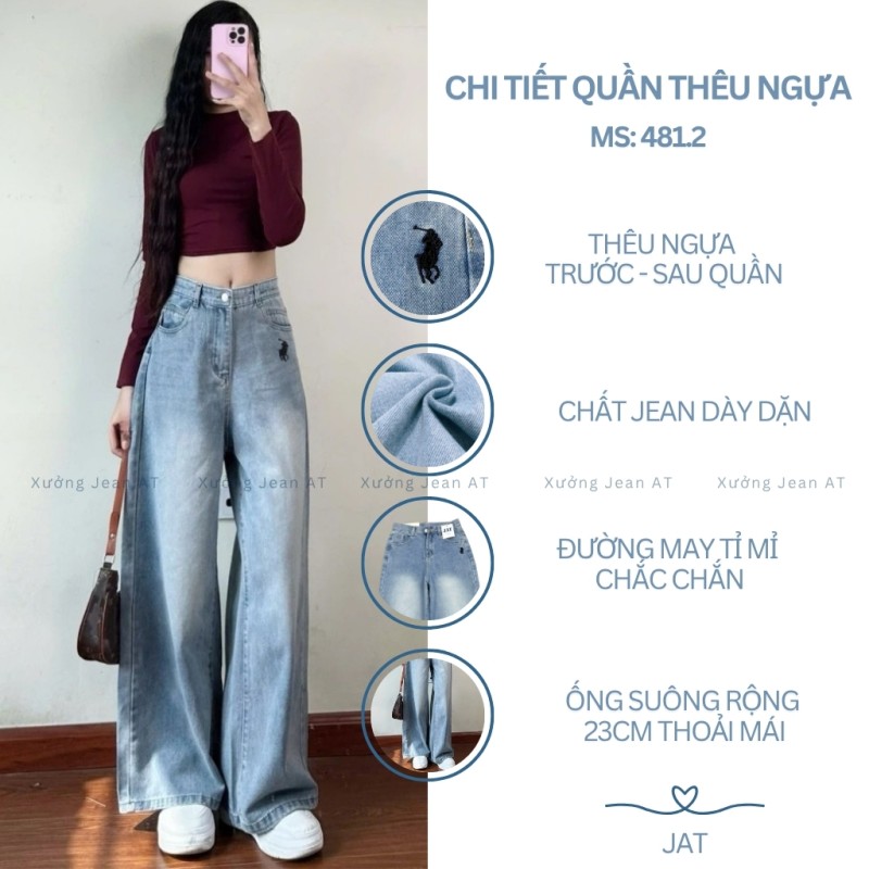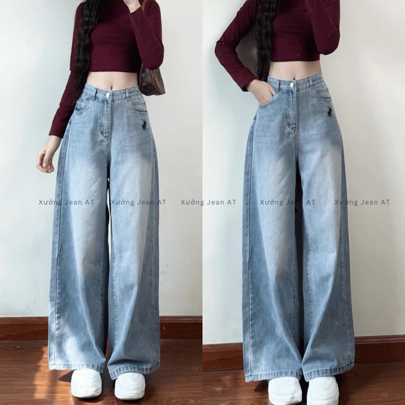 Quần Jean Nữ Ống Suông Rộng Xanh Wash Bụi Thêu Ngựa Lưng Cao Hàn Quốc 481.2