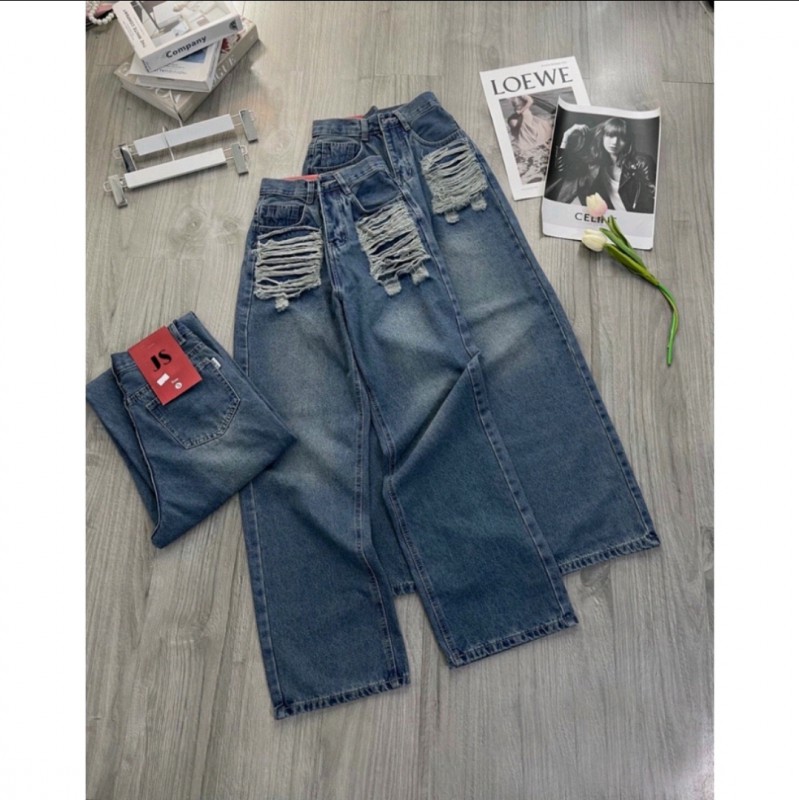 ❌ THÔNG TIN SẢN PHẨM : Quần Jeans Nữ Ống Rộng Cào Rách 2 Bên Túi, Quần Bò Ống Rộng Lưng Cao Siêu Phá Cách Màu Xanh Đậm 310.2