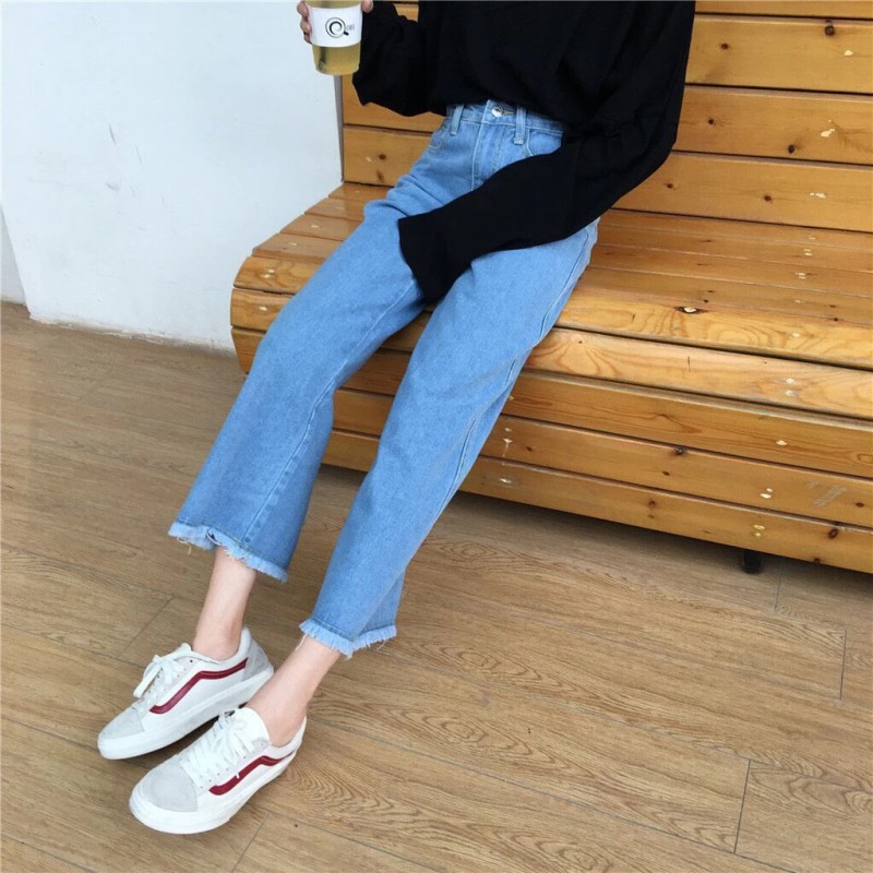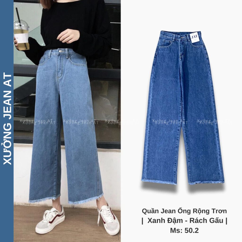 HƯỚNG DẪN MUA HÀNG : Quần Jeans Ống Rộng Trơn Màu Xanh Đậm Rách Gấu Lưng Cao Trẻ Trung Năng Động 50.2