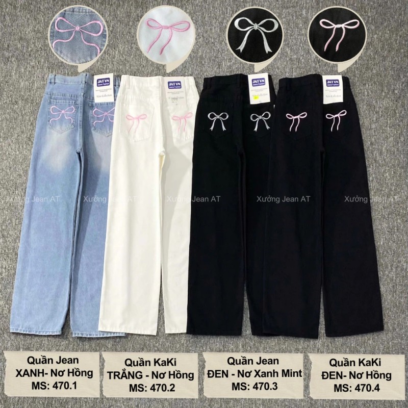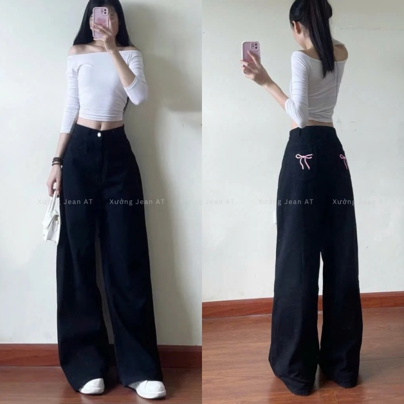 Quần Jean Nữ Ống Rộng Wash Bụi Thêu Nơ Túi Sau Phong Cách Hàn Quốc Cực Xinh 470