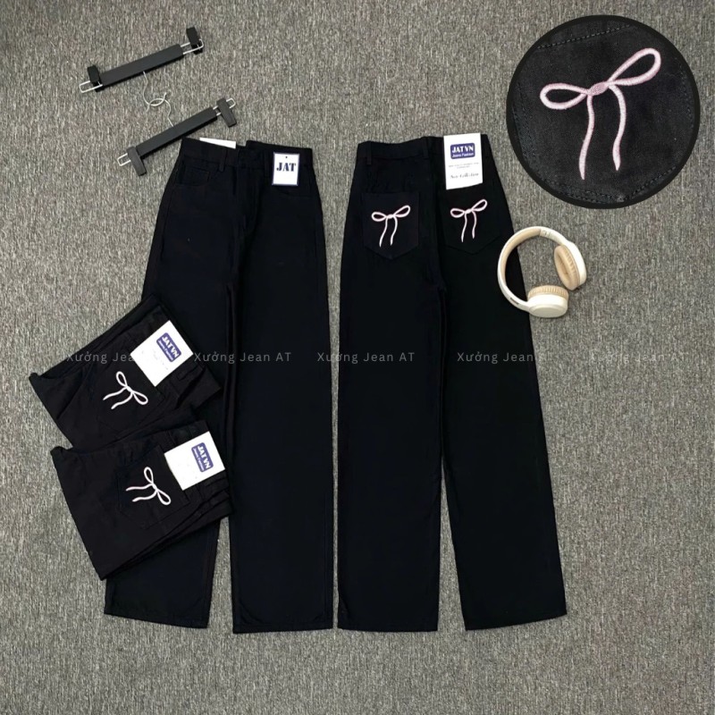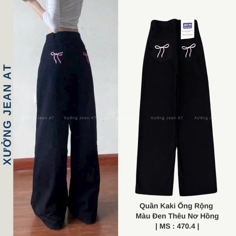 Quần Kaki Nữ Ống Rộng Đen Thêu Nơ Hồng Lưng Cao Dáng Suông Dễ Thương Phong Cách Hàn Quốc 470.4