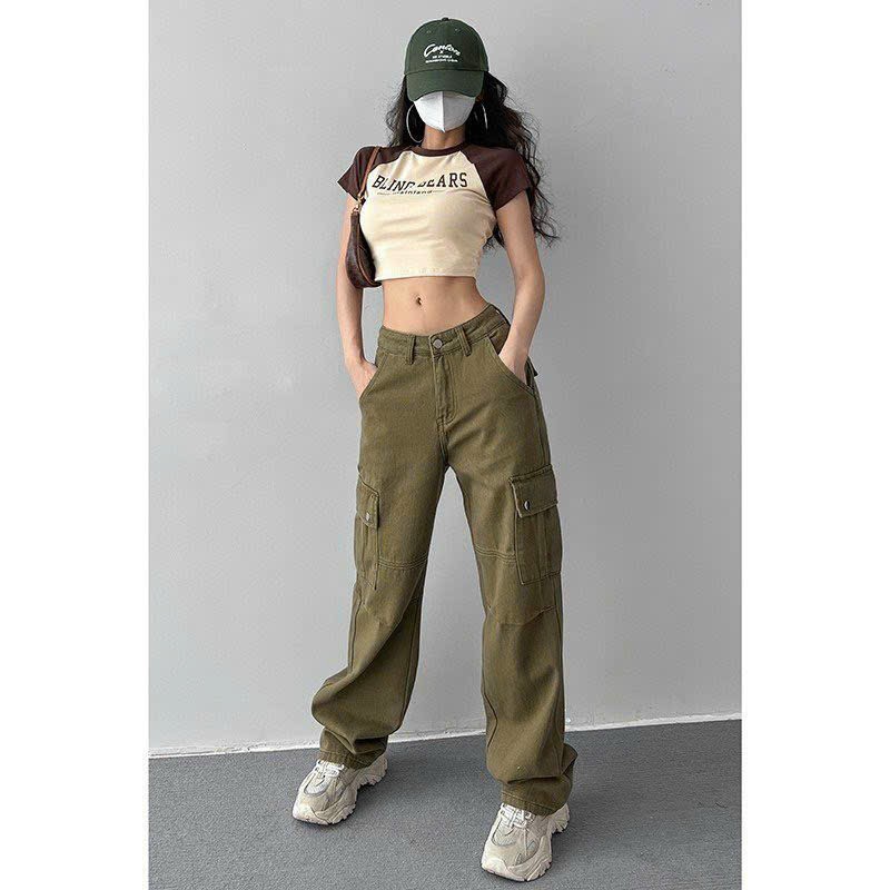 Quần Kaki Nữ Ống Rộng Lưng Cao 2 Túi Hộp Cực Cá Tính Màu Rêu Form Trơn Nam Nữ Unisex 570.3