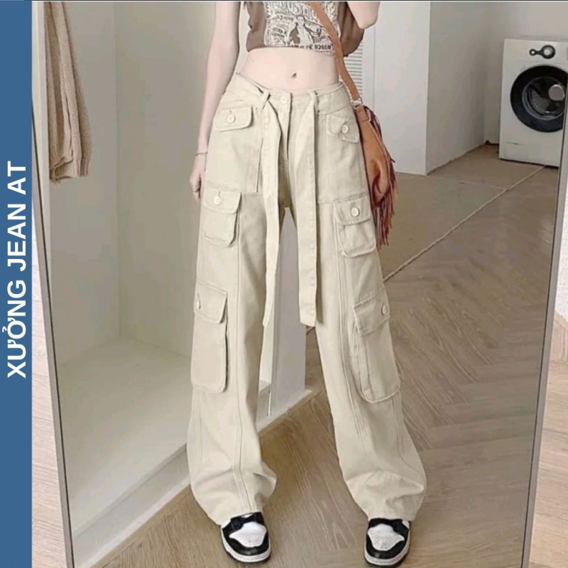 Quần Kaki Nữ Ống Rộng Túi Hộp Phối Dây Màu Kem Lưng Cao Dáng Suông Phong Cách Ulzzang Cực Chất Unisex Nam Nữ 562.2