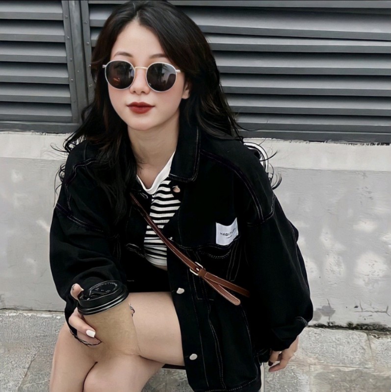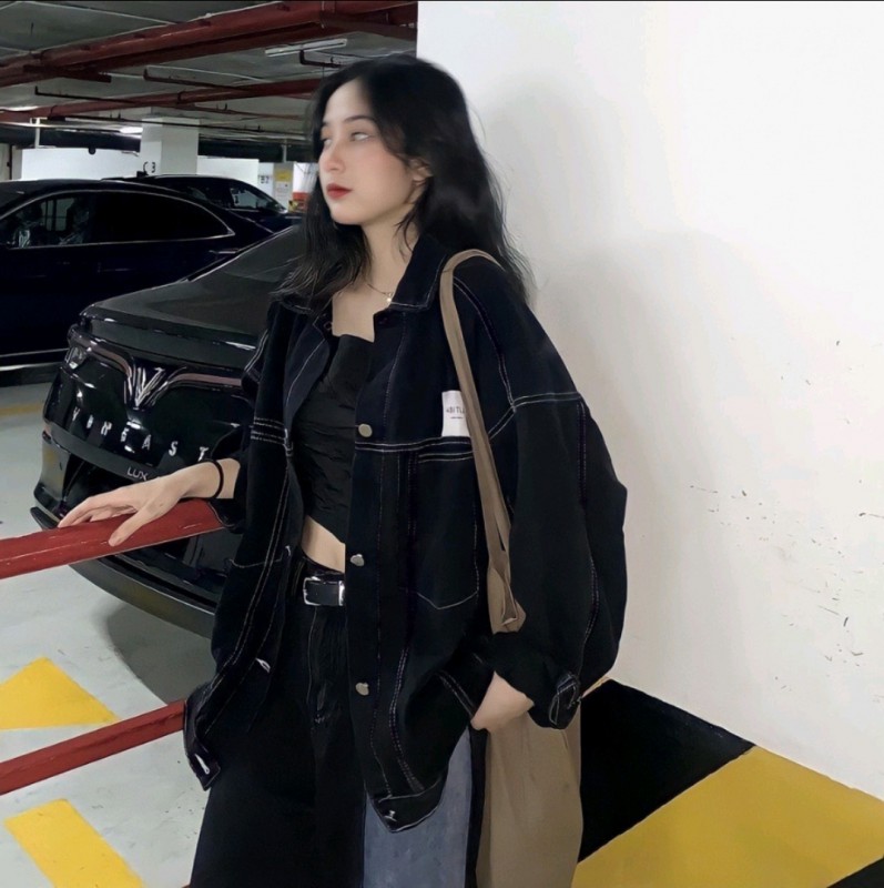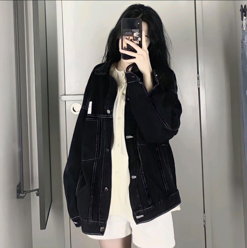 HƯỚNG DẪN MUA HÀNG : Áo Khoác Jean Nữ Form Rộng UNISEX Nam Nữ Màu Đen Chỉ Nổi - Áo Khoác Bò Nữ Thêu Chữ Habit Freesize Dưới 62kg - 543.1