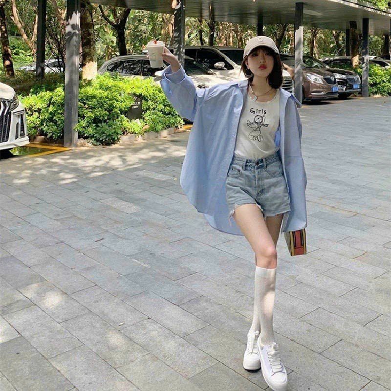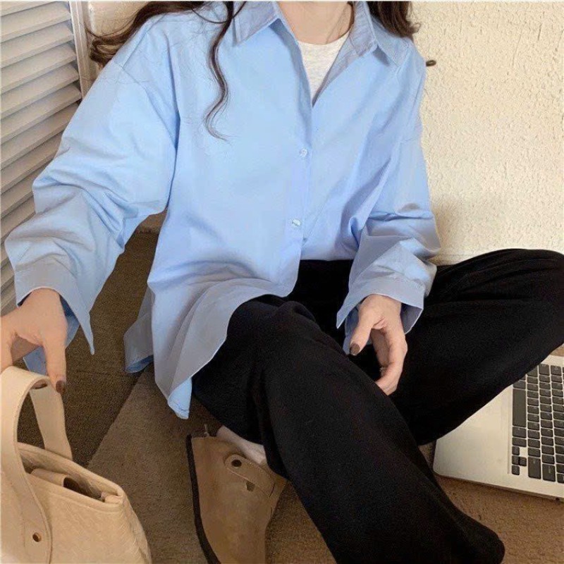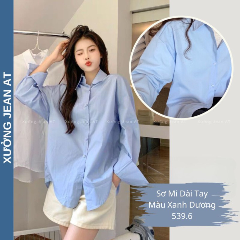 Áo Sơ Mi Nữ Form Rộng Dài Tay Cotton Lụa Hàn Unisex Màu Xanh Dương Cực Xinh - 539.6
