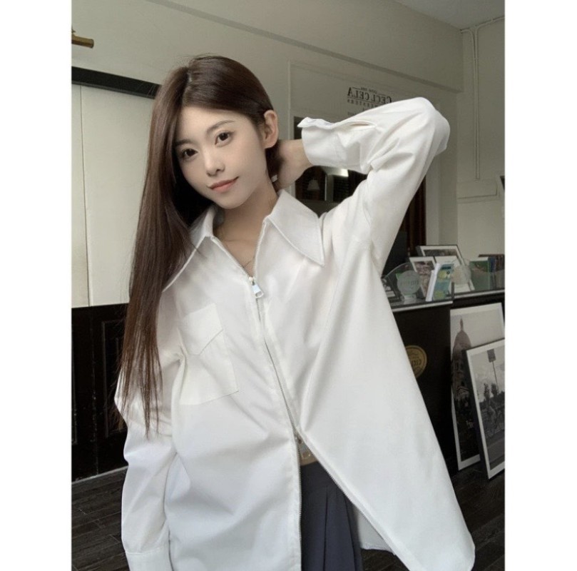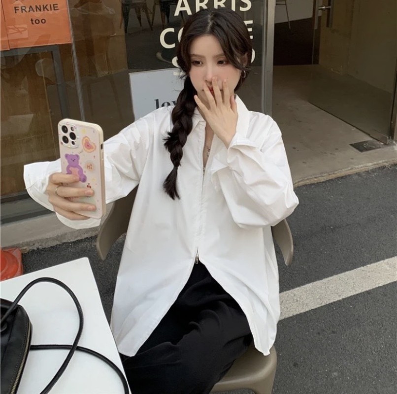 Áo Sơ Mi Nữ Tay Dài Màu Trắng Form Rộng Khoá Kéo 2 Chiều Chất Cotton Lụa Co Giãn 467.1