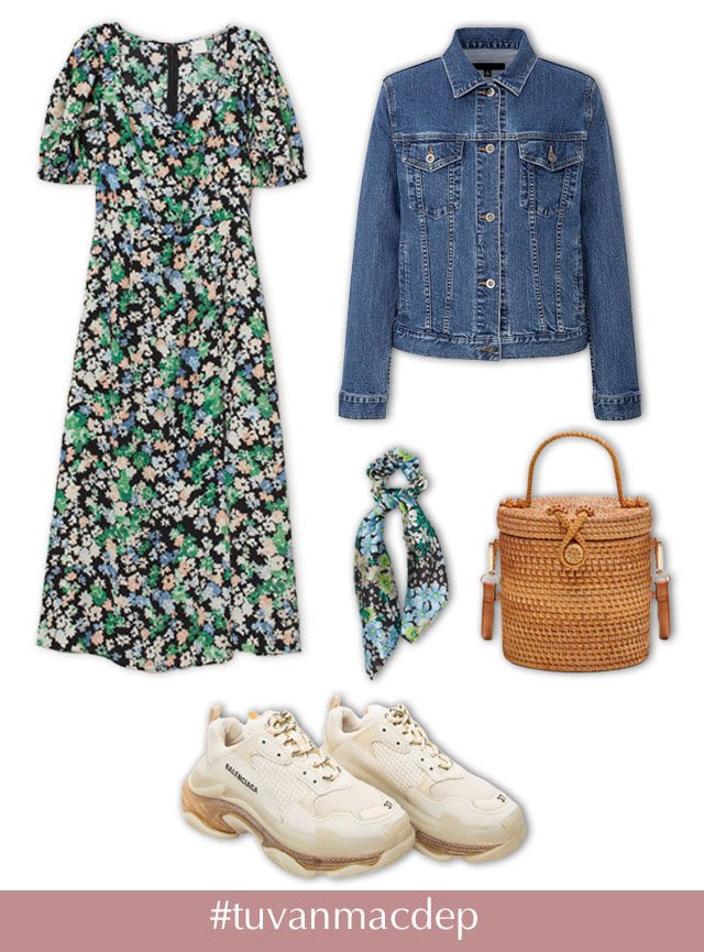 Đầm hoa cổ V là kiểu thiết kế giúp các cô gái hoàn thiện vẻ ngoài dịu dàng và nữ tính cũng như khoe khéo được thềm ngực đầy gợi cảm mà không quá phô phang. Để tăng thêm tính thời thượng và sành điệu cho tổng thể, một chiếc áo khoác jeans là sự lựa chọn hoàn mỹ giúp các cô nàng trông phóng khoáng và năng động hơn trong ngày hẹn hò. Mùa này, cột tóc ton - sur - ton với trang phục trở thành xu hướng được ưu chuộng hàng đầu. Kết hợp với chiếc túi cói dáng cặp lồng mộc mạc giản dị và đôi sneaker mang màu sắc đồng điệu là đủ để bạn hút trọn sự chú ý của chàng.
