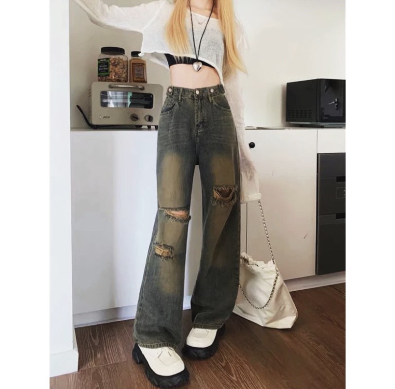 Quần Jean Nữ Ống Rộng Lưng Cao Wash Vàng Rách Phối Nút Eo Cực Cá Tính Phong Cách Hàn Quốc 314.4