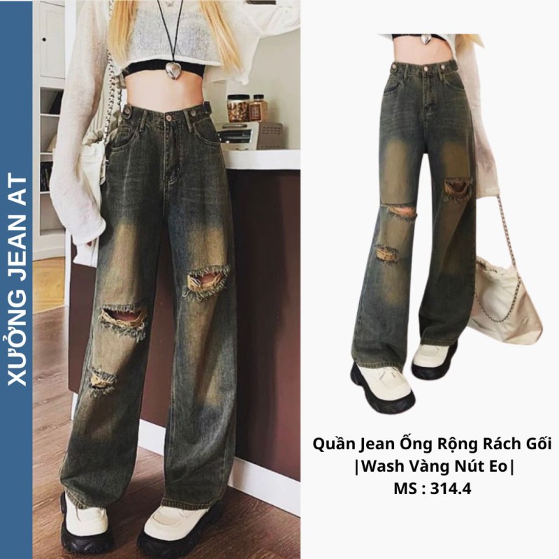 Quần Jean Nữ Ống Rộng Lưng Cao Wash Vàng Rách Phối Nút Eo Cực Cá Tính Phong Cách Hàn Quốc 314