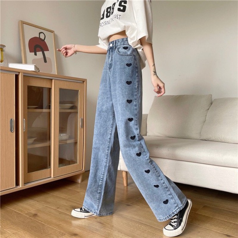 Quần Jean Nữ Ống Rộng Màu Xanh Nhạt Chất Bò Kèm Hoạ Tiết Trái Tim Phong Cách Trẻ Trung 525