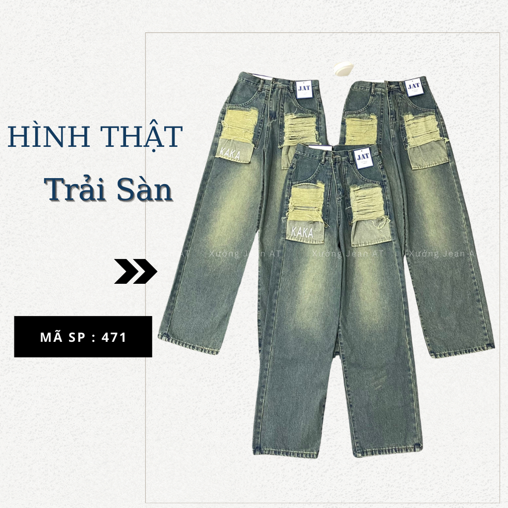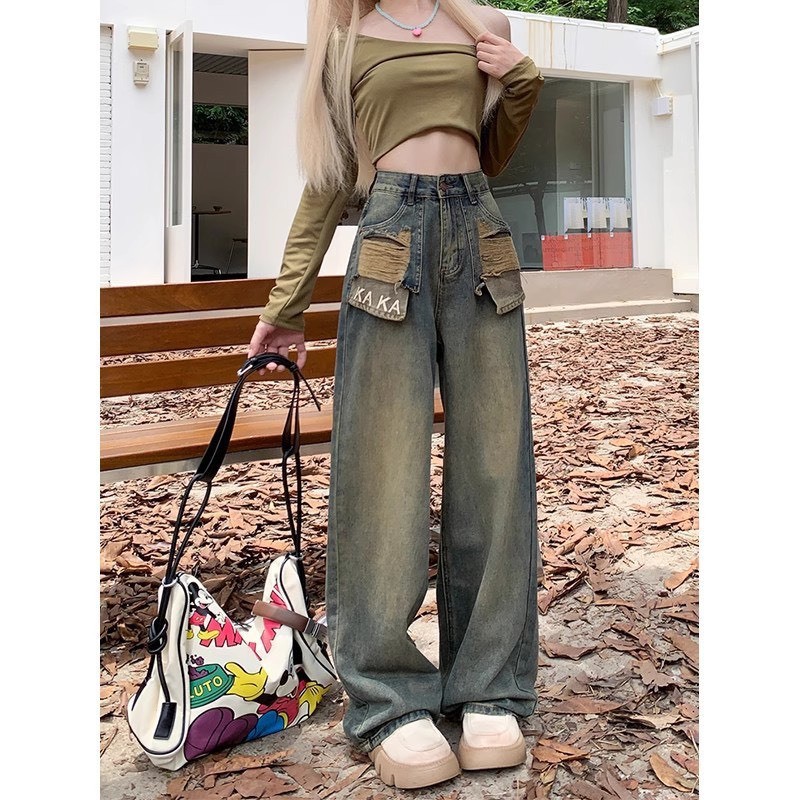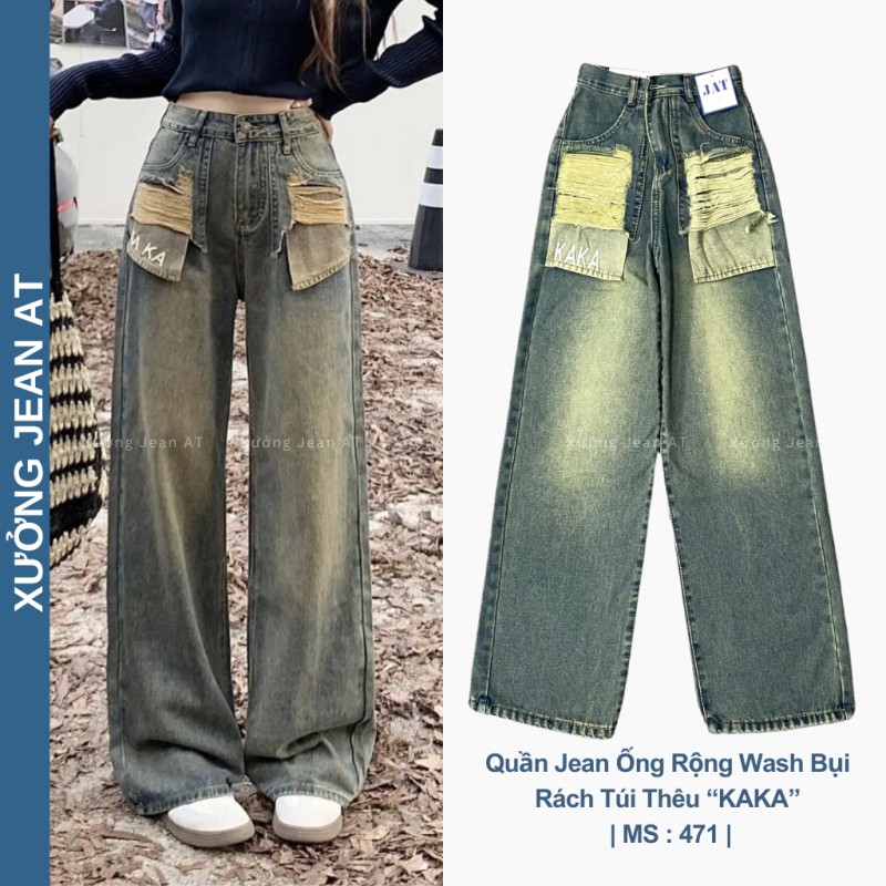 ❌ THÔNG TIN SẢN PHẨM : Quần Jean Nữ Ống Suông Rộng Wash Bụi Phối Túi Rách Thêu Chữ KAKA Phong Cách Retro Cực Chất 471