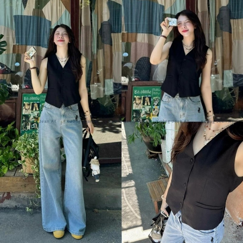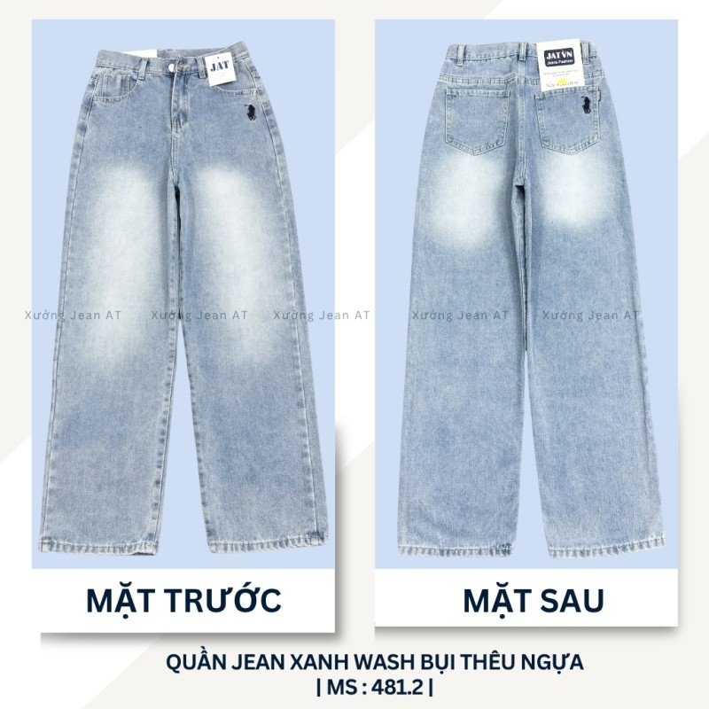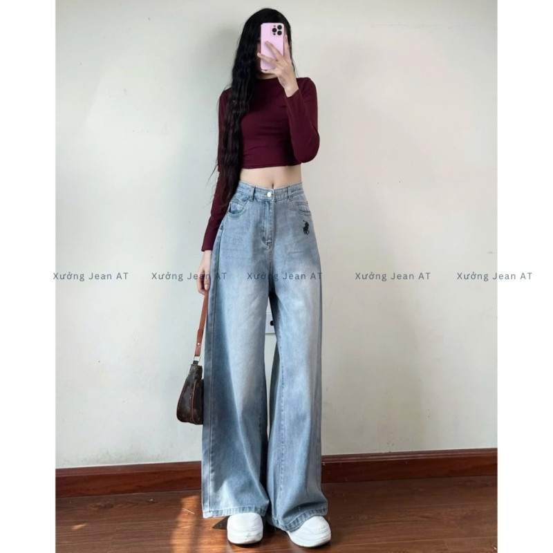 Quần Jean Nữ Ống Suông Rộng Xanh Wash Bụi Thêu Ngựa Lưng Cao Hàn Quốc 481.2