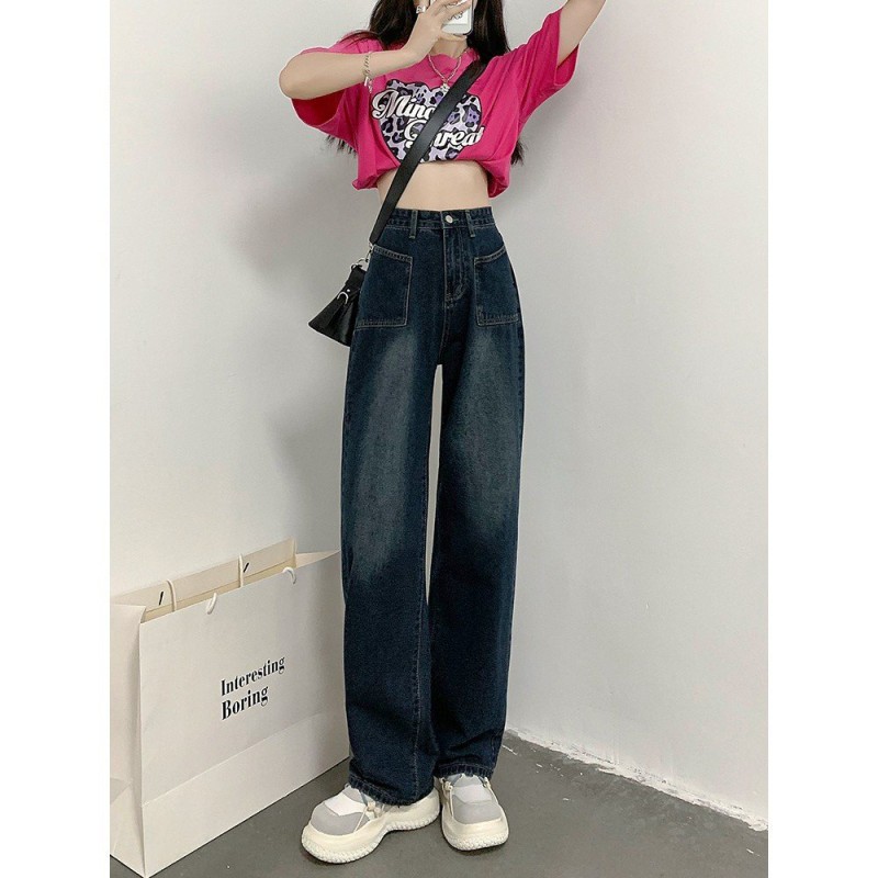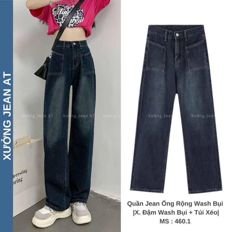 Quần Jean Ống Rộng Nữ Túi Vuông Lưng Cao Wash Màu Xanh Đậm Cá Tính, Quần Bò Cạp Cao Phong Cách Retro 460.1