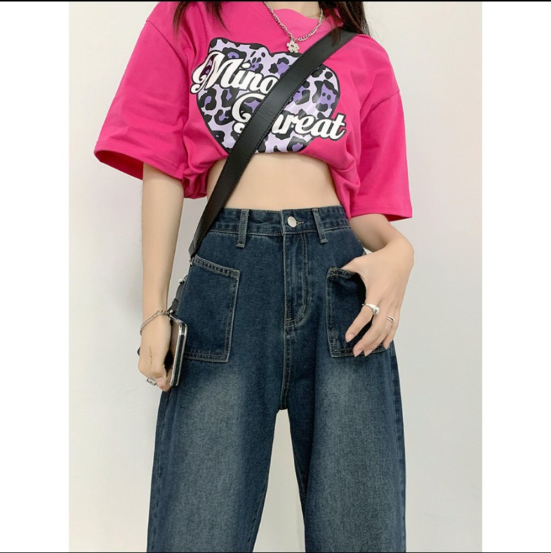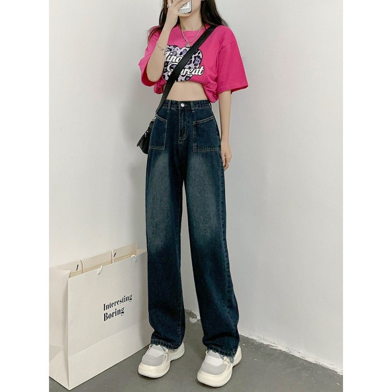 Quần Jean Ống Rộng Túi Vuông Lưng Cao Wash Màu Cá Tính, Quần Bò Cạp Cao Màu Xanh Phong Cách Retro 460