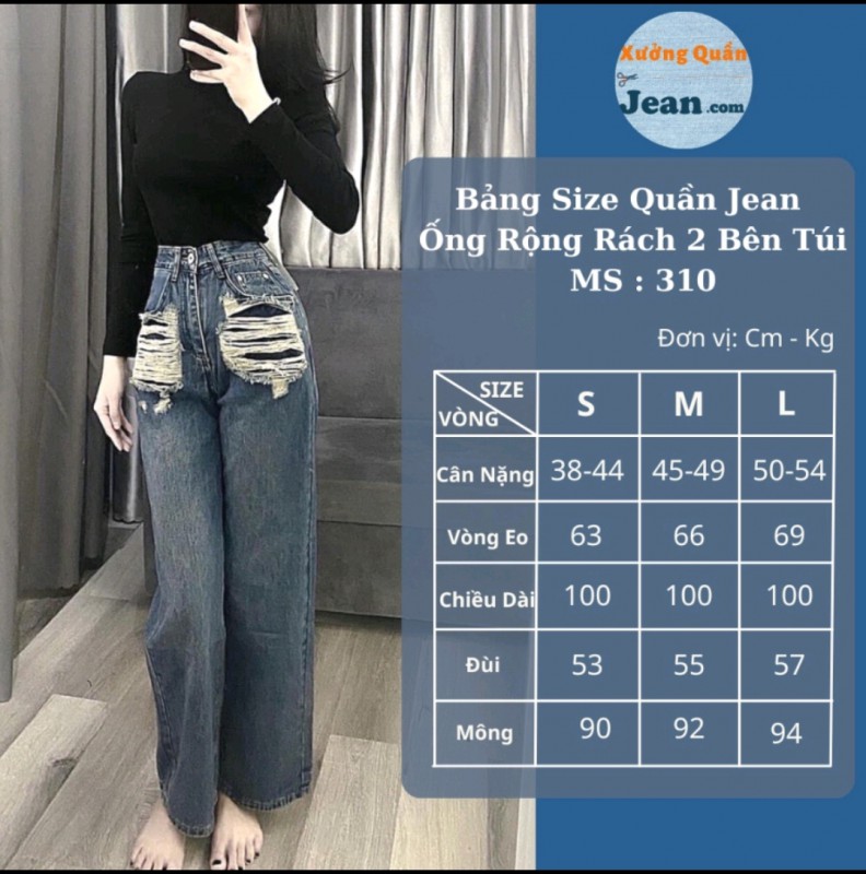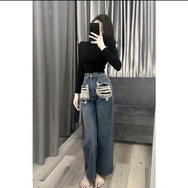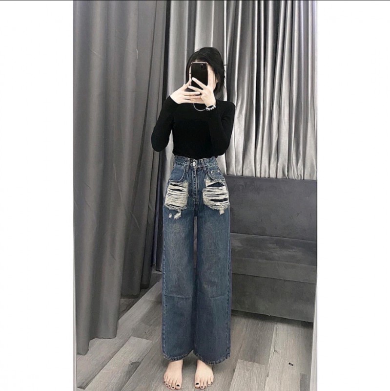 ❌ THÔNG TIN SẢN PHẨM : Quần Jeans Nữ Ống Rộng Cào Rách 2 Bên Túi, Quần Bò Ống Rộng Lưng Cao Siêu Phá Cách Màu Xanh Đậm 310.2