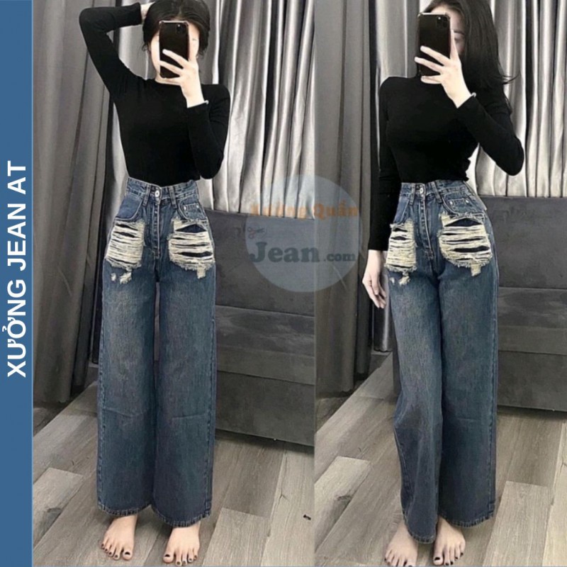 Quần Jeans Nữ Ống Rộng Cào Rách 2 Bên Túi Lưng Cao Siêu Phá Cách Màu Xanh Đậm - 310.2