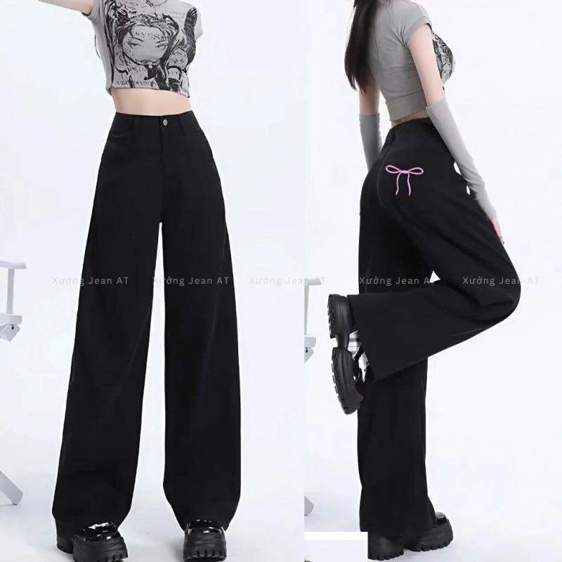 Quần Kaki Nữ Ống Rộng Đen Thêu Nơ Hồng Lưng Cao Dáng Suông Dễ Thương Phong Cách Hàn Quốc 470.4